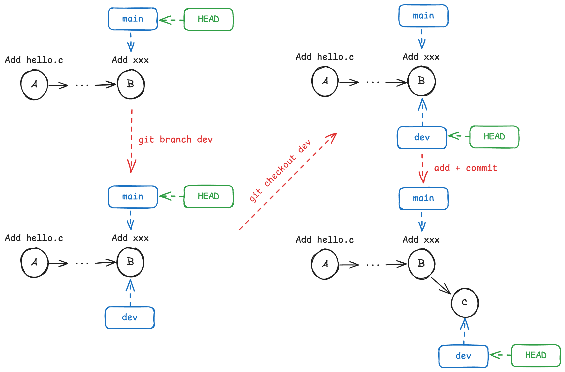 - 创建分支- git branch <BRANCH>:基于当前的- HEAD。