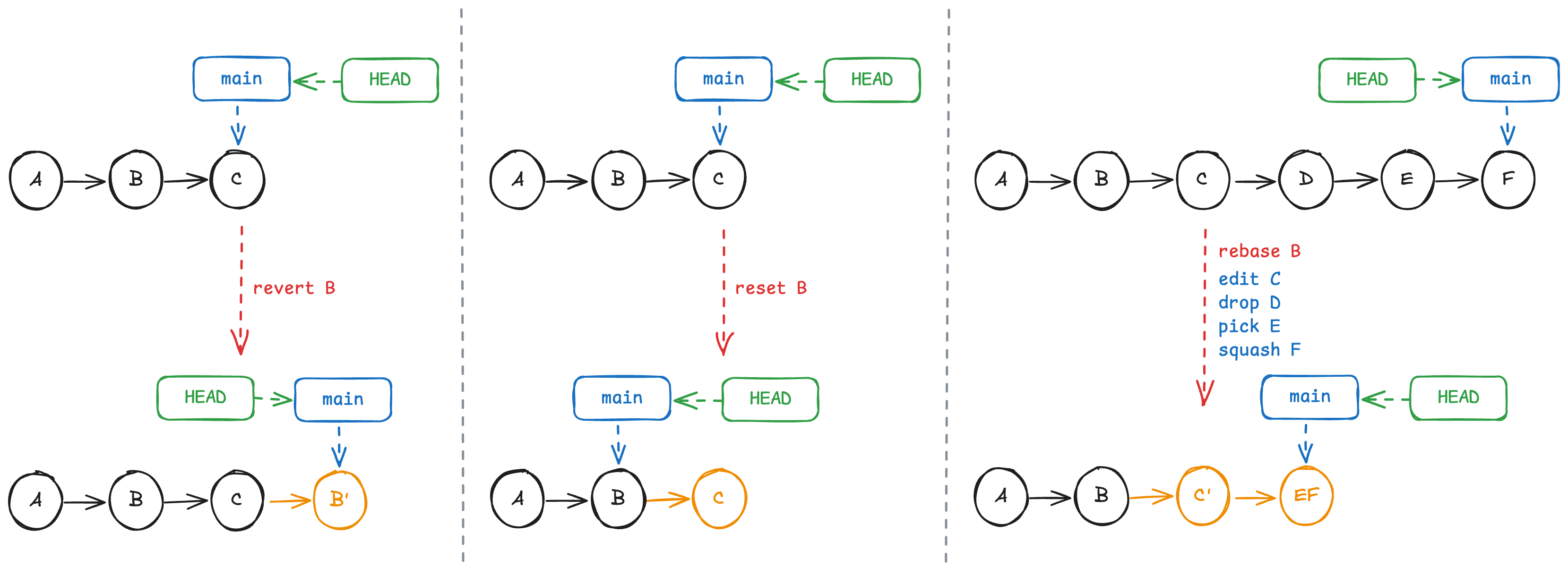 - git revert <COMMIT>:创建一个新的提交,撤销某次提交的修改。