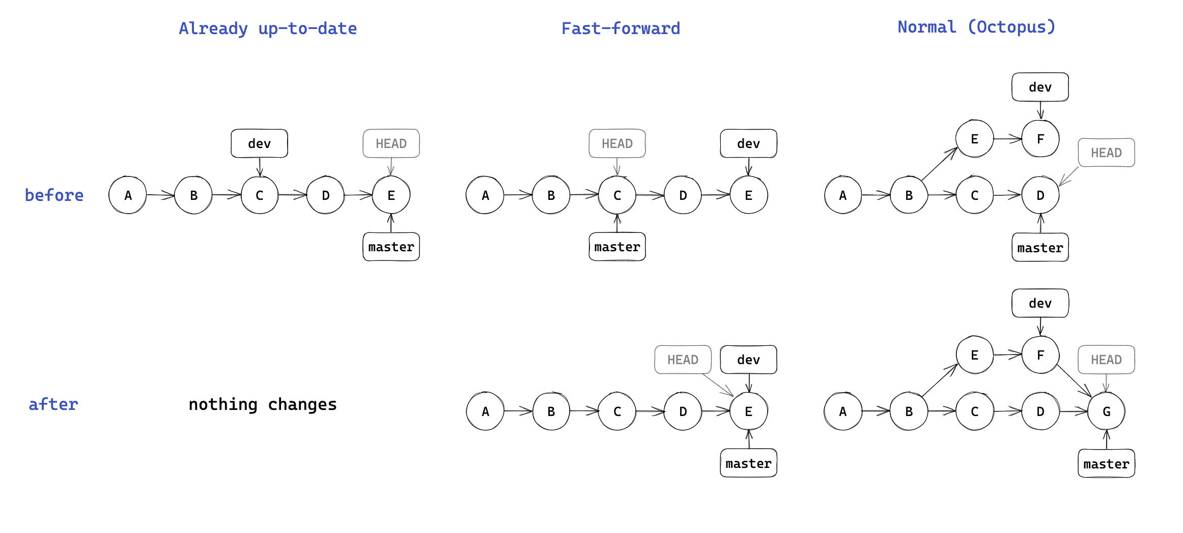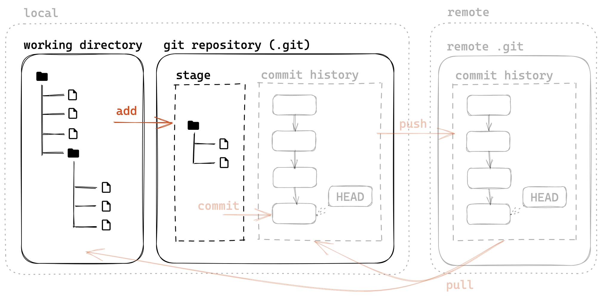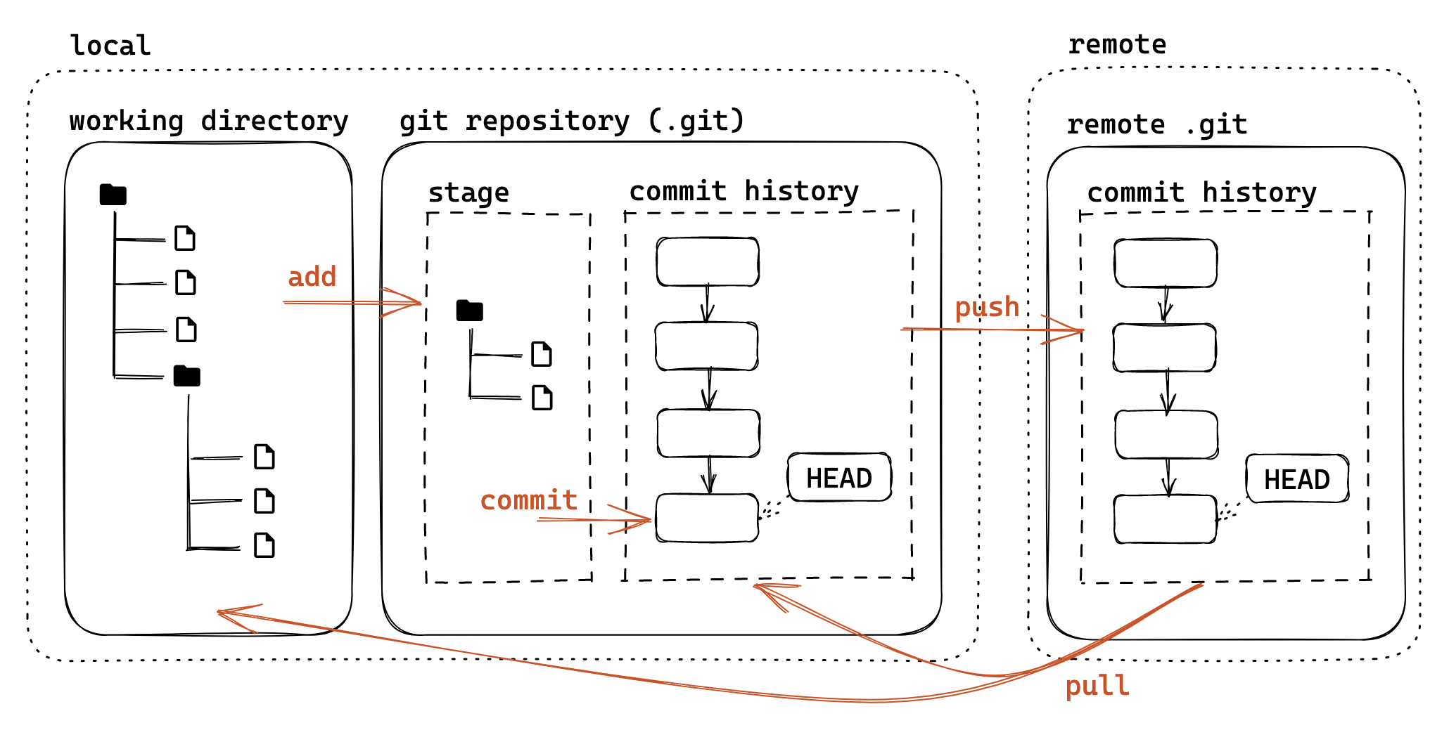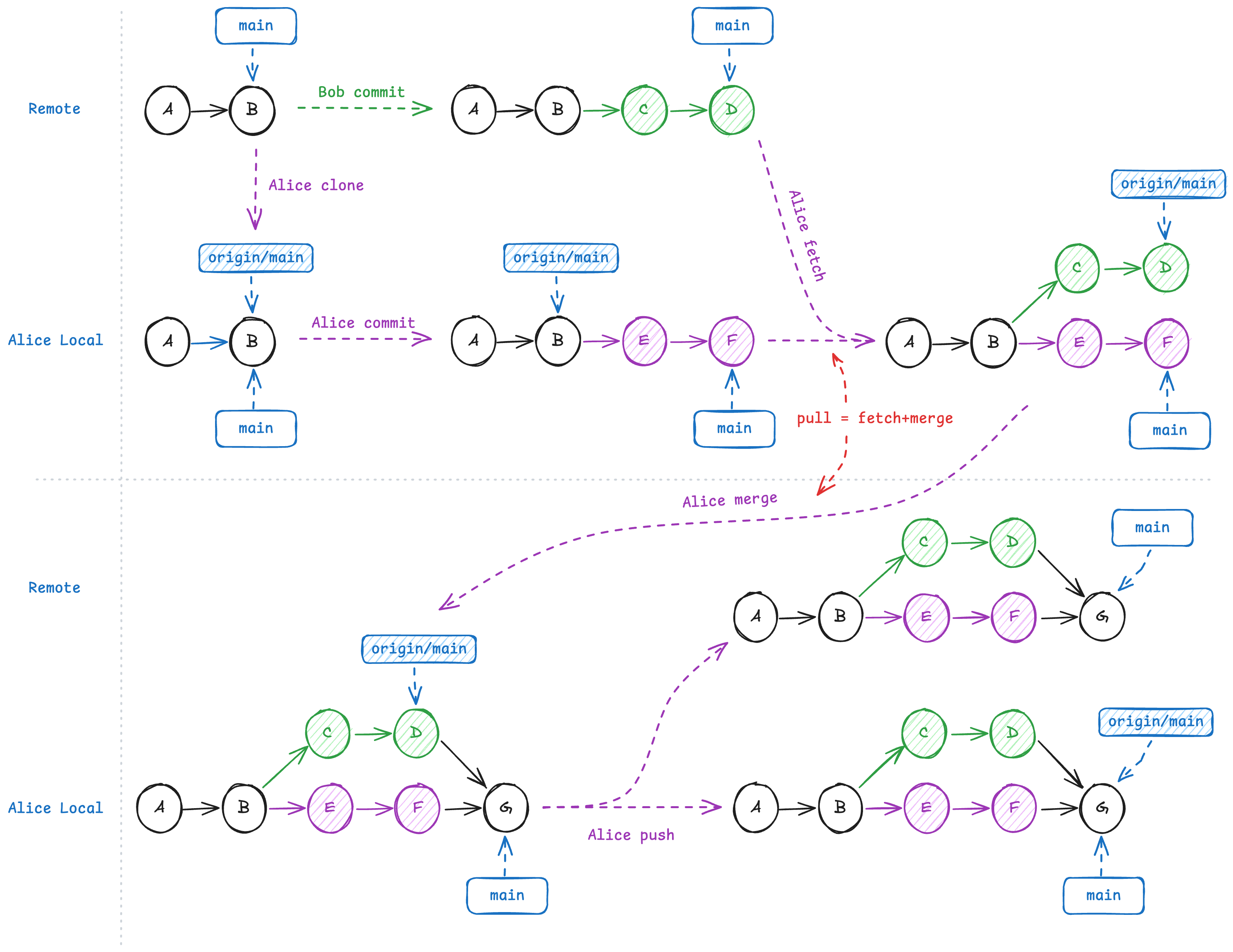 - git pull:将远程版本库的提交拉取到本地,等价于- git fetch+- git merge。