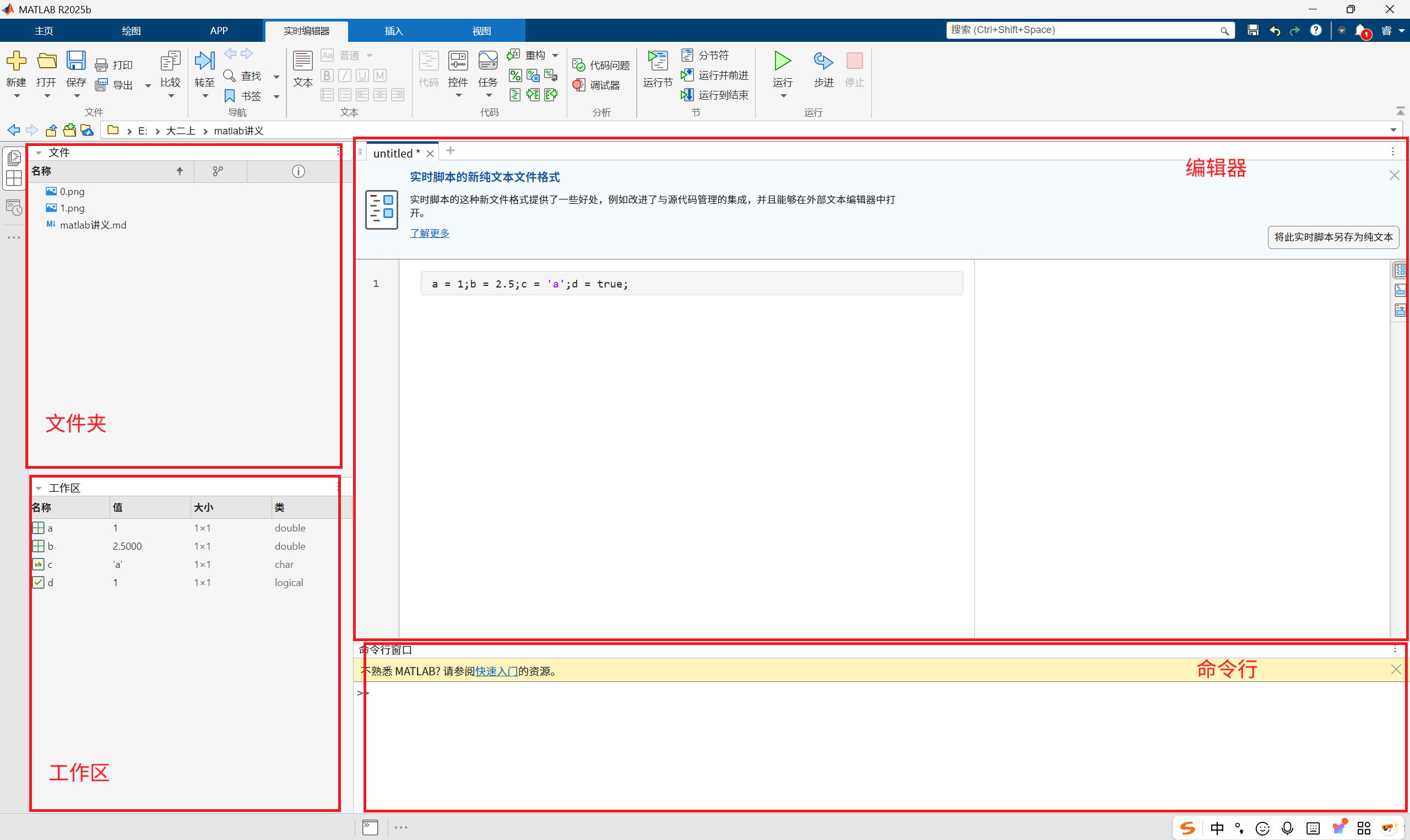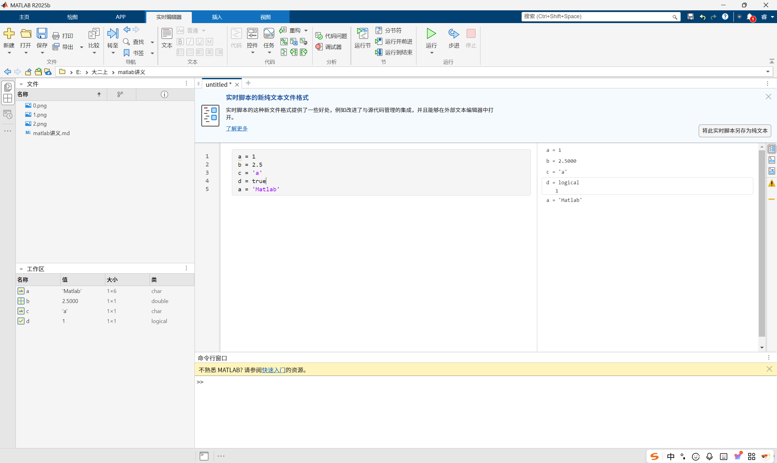 Matlab有两个重要文件格式:.m(脚本)和.mlx(实时脚本)。其中.m是和.c/.cpp差不多的纯文本文件格式,而.mlx是最近Matlab推荐的文件格式,不仅支持代码的编辑,同时支持富文本注释。本次课使用.mlx,即实时脚本。